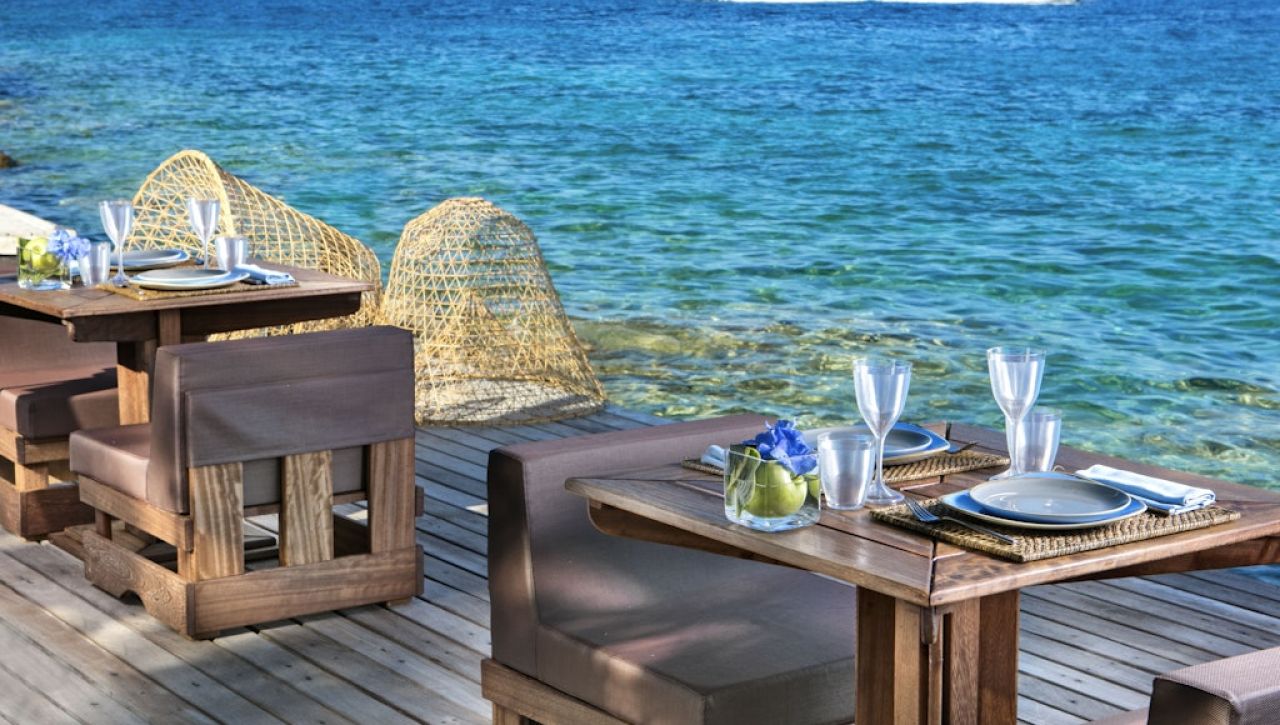 Večeře probíhají v klidné atmosféře, často s výhledem na moře nebo západ slunce, což patří k nejsilnějším zážitkům pobytu.