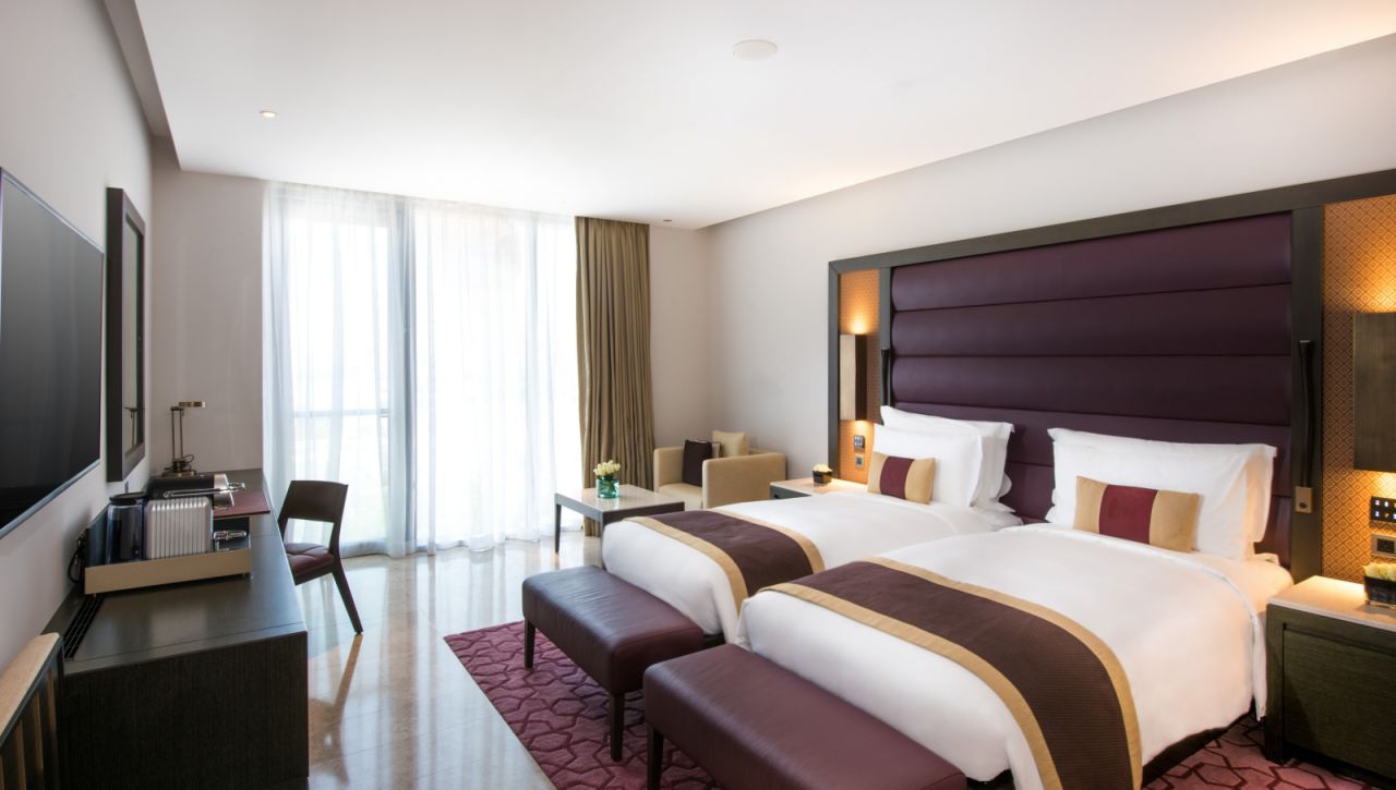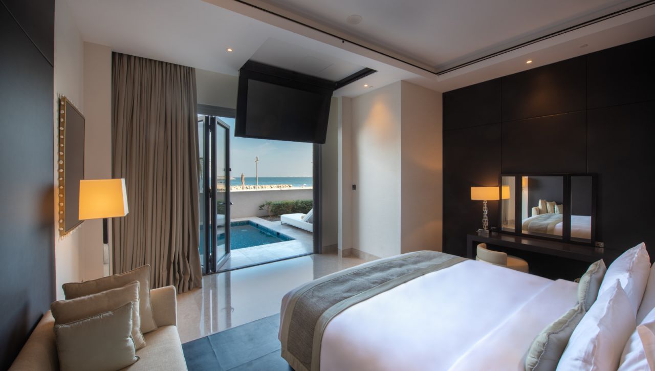 Pokoje a suity jsou navrženy tak, aby hosty obklopily světlými tóny, přírodními materiály a elegantní jednoduchostí. Velká panoramatická okna otevírají výhledy na moře, zahrady nebo přístav Al Mouj Marina. Interiéry jsou moderní, měkké v detailech a zároveň prostorné – s luxusními koupelnami, jemnými textiliemi a dekoracemi odkazujícími na ománské řemeslo. Prémiové suity a Club pokoje poskytují další úroveň pohodlí díky privátním lounge službám, osobnímu přístupu a exkluzivním výhodám. Nejvyšší kategorií jsou pak rozsáhlé rezidence a suity s velkými terasami, odkud je západ slunce nad mořem nezapomenutelný zážitek.