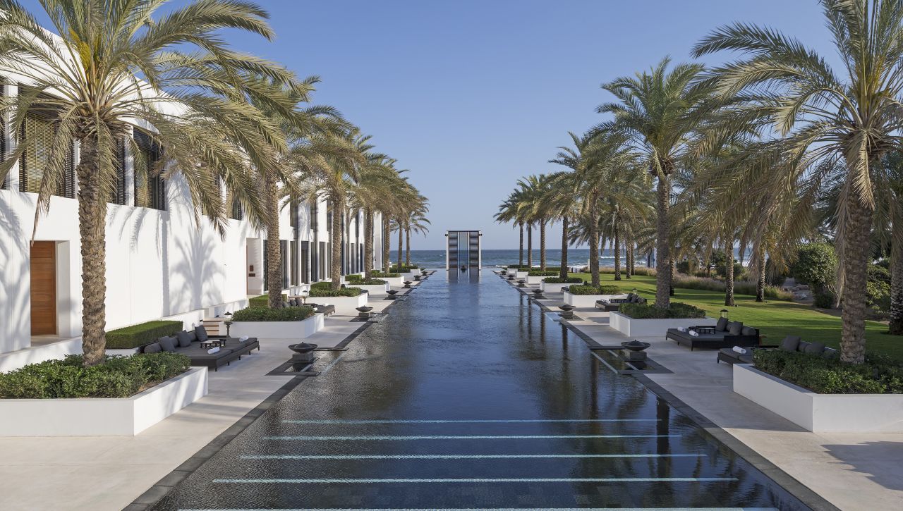 The Chedi Muscat je proslulý svými ikonickými bazény, včetně 103metrového Long Pool, jednoho z nejdelších infinity bazénů na Blízkém východě. Tyto bazény obklopené palmovými alejemi a minimalistickou architekturou vytvářejí prostředí, které působí jako zenová galerie pod otevřeným nebem. Zahrady jsou precizně upravené a plné klidu, tvořící dokonalou kulisu pro relaxaci i procházky.