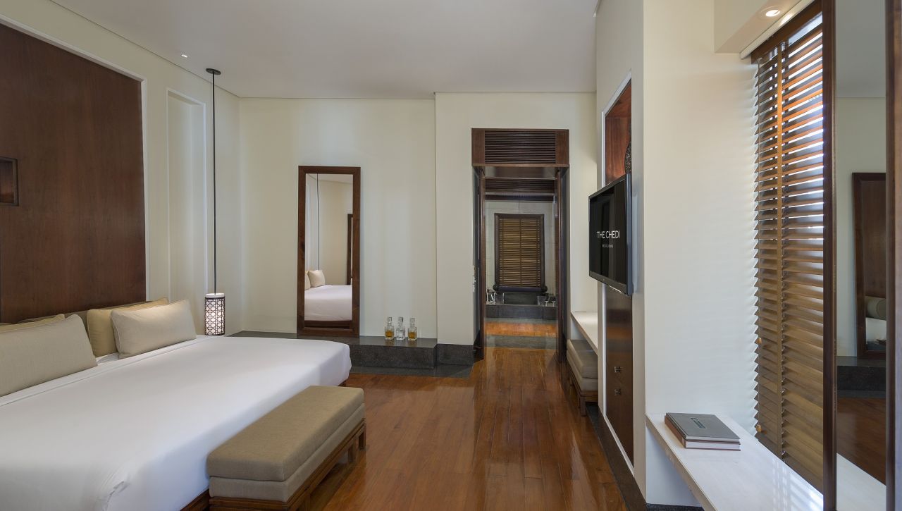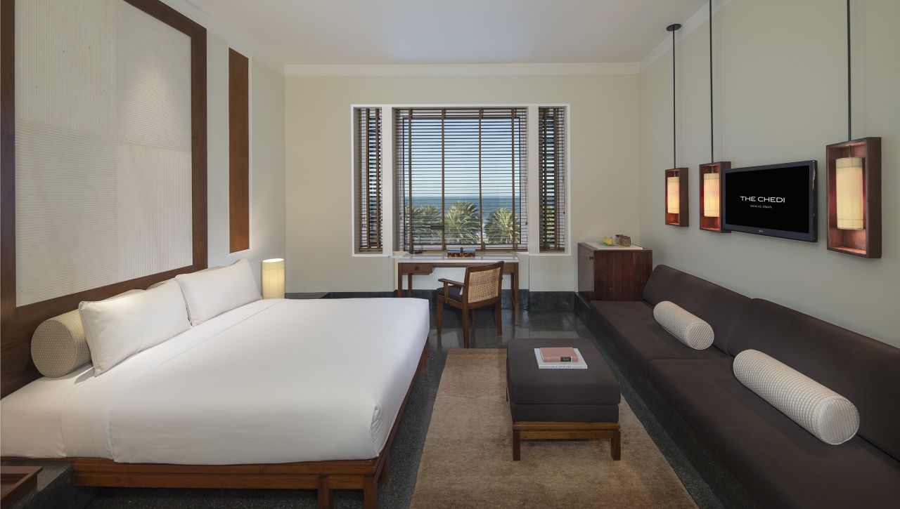 Pokoje a suity The Chedi Muscat jsou navrženy v duchu čistého minimalismu s důrazem na prostor, světlo a naprostou jednoduchost. Přírodní dřevo, bílá paleta barev, kamenné detaily, jemné textilie a velká panoramatická okna vytvářejí interiér, který je klidný, vzdušný a unikátně harmonický. Soukromé zahrady, lounge zóny, otevřené koupelny a výhledy na moře nebo palmové zahrady dotvářejí charakter místa, kde nic nepřebývá a vše má svůj smysl.